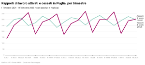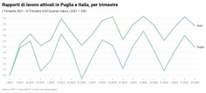 Il mercato del lavoro mostra un andamento vivace ma ancora altalenante: sia in Puglia sia in Italia le attivazioni contrattuali seguono un chiaro ritmo stagionale. L’Italia mantiene valori più alti lungo tutto il periodo, mentre la Puglia cresce ma con maggiore volatilità, segnalando una dinamica positiva ma ancora più fragile rispetto al quadro nazionale.
